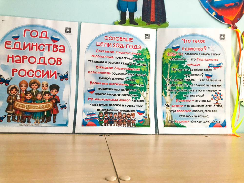 В группе «Капитошка» воспитателем Сунко Т.А. сделан стенд приуроченный к «Году единства народов России», папка передвижка, где обозначены основные цели 2026 года и что такое единство, консультация для родителей «Как воспитать у ребенка уважение к людям других национальностей и их культуре» Единство народов во все времена было и остаётся главной национальной идеей России, залогом её достойного будущего, для того, чтобы добиться успеха, все мы должны быть вместе, независимо от возраста, рода занятий, национальности и политических взглядов.