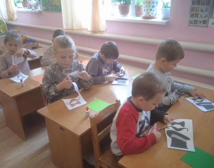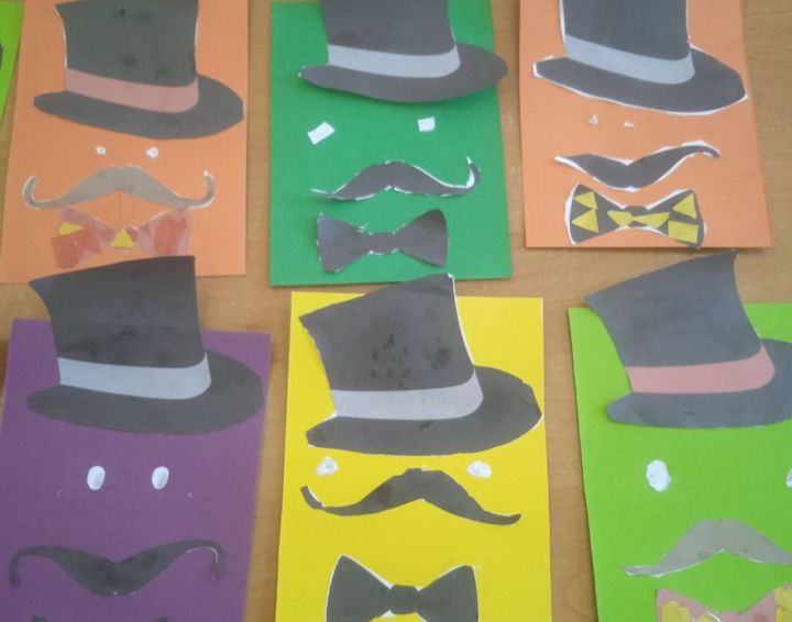 Ребята с улыбками наклеили папам усы, шляпы, галстук — бабочка. Работы получились забавные и смешные, дети остались довольны.