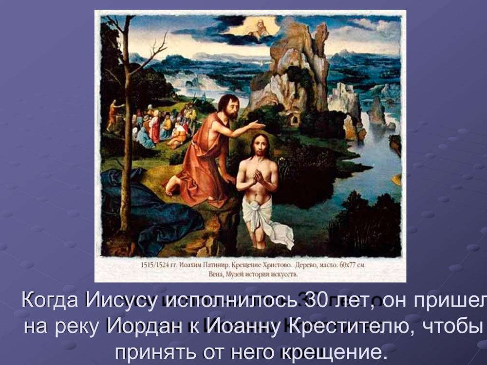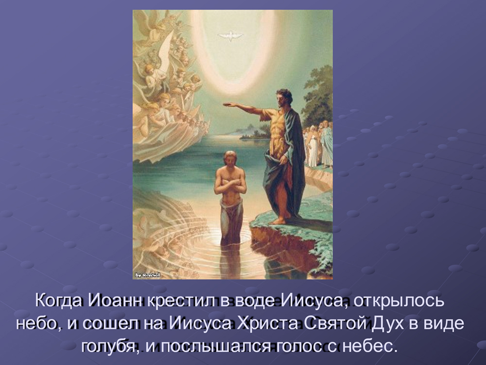 Согласно евангельскому рассказу, к Иоанну Крестителю, находившемуся у реки Иордан в Вифаваре, пришёл Иисус Христос (в 30-летнем возрасте) с целью принять крещение. Во время крещения на Иисуса сошёл Святой Дух в виде голубя.