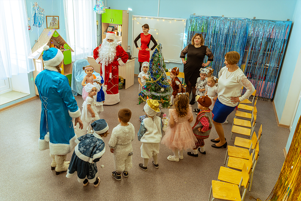 В организации праздничной сказочной атмосферы задействованы все педагоги дошкольного учреждения. Зал нарядно украшен, елка сияет огнями – атмосфера настоящей сказки царила повсюду. Детей ждали необычные гости. Сказочные персонажи играли с детьми, шутили и создавали праздничное настроение.